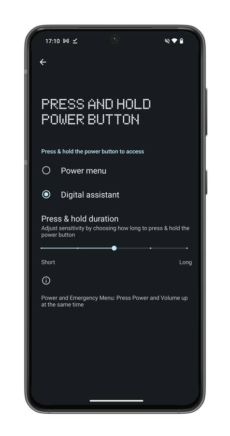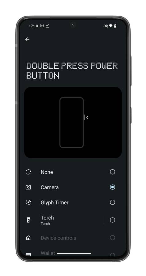 With Nothing OS, you can assign several shortcuts to the power button on your Nothing Phone. You can choose from different system shortcuts: camera, flashlight, timer, or applications. The Nothing Phone can recognize two different shortcuts—a double press and a long press on the on/off button.