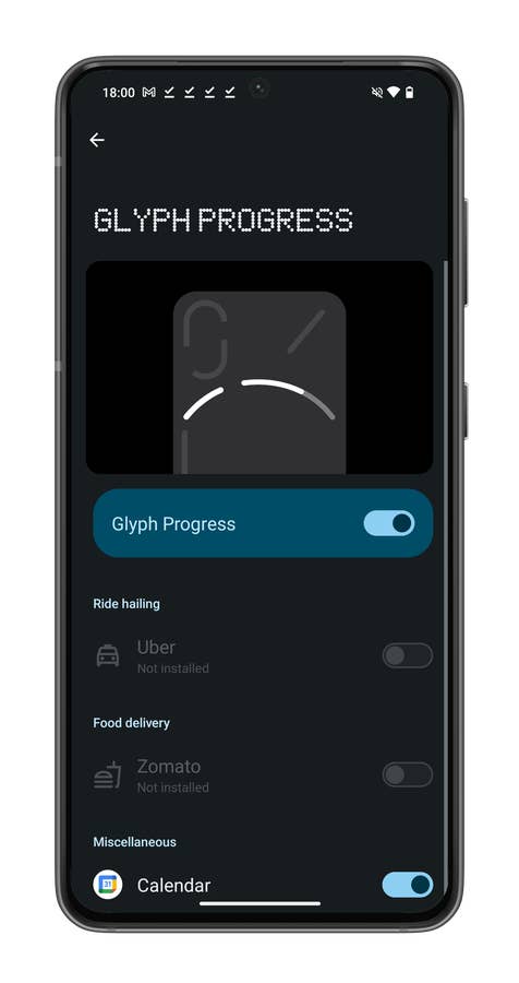 At the moment, only three applications are supported. Uber, Zomato, and Google Calendar. I decided to use it with Google Calendar. Five minutes before an event, a countdown begins with the Glyph light bar gradually emptying. It’s very gimmicky and doesn’t work all the time. With my work Google account, it didn’t even work at all, so I had to use my personal account.
