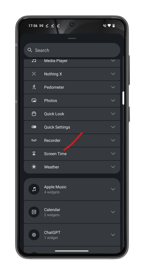 - In the menu under Nothing Widgets, search for the Screen Time widget.