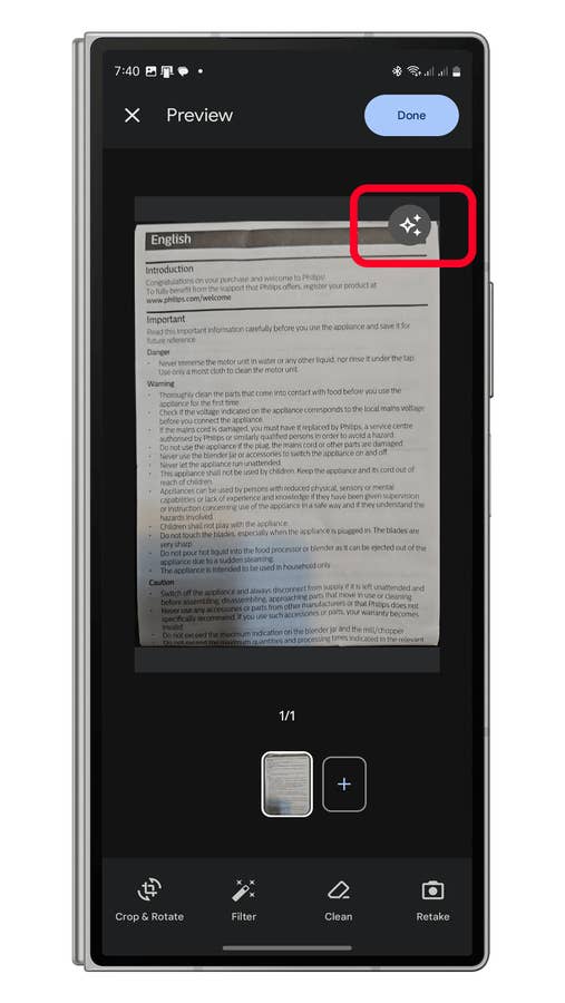If you prefer manual adjustments, you can disable auto-enhancement and access options like Crop, Rotate, Filter, and Clean, offering finer control over your scanned images.