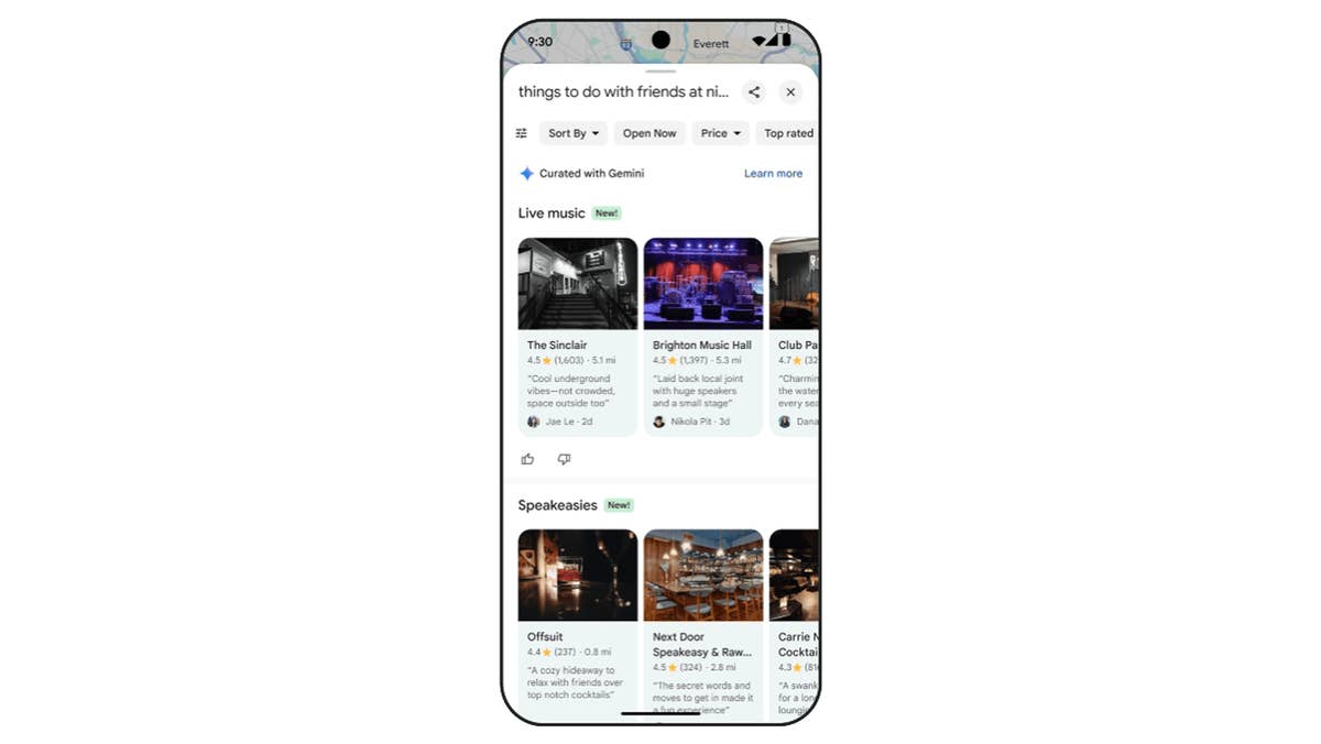 Gemini also enables smarter search capabilities within Google Maps. Beyond just looking for places or planning your routes, you can now perform contextual searches such as “top things to do at night in this city” or “top-rated Thai restaurants.” The search results will show curated suggestions of places or activities and summarized reviews. You can further ask follow-up questions about a place using the “Ask Maps about this place” feature.