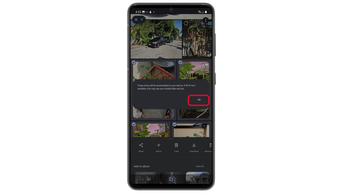 Previously, when bulk download wasn’t available, selecting multiple photos and videos would not display the Download button. Now, the button remains visible. Once you’ve chosen the media and tap “Download,” a data usage warning may pop up for metered Wi-Fi connections. After confirming, the files download in the background, and you can see an animated progress indicator on each photo or video.