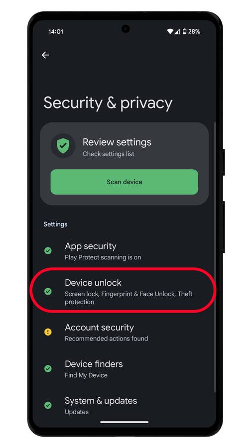 - Choose Security & privacy, then Device unlock.