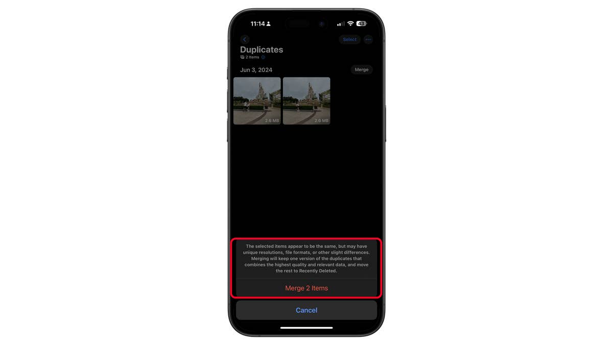According to Apple, merging duplicates ensures that the image is kept with the best quality and the metadata is combined consistently.