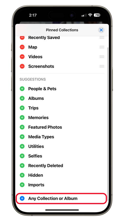 - Touch and hold the three horizontal lines next to a pinned album, then drag it to rearrange the order.