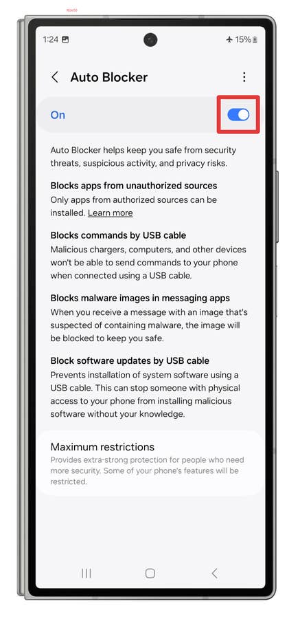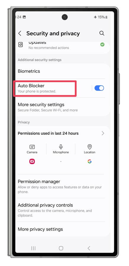 One of the big new features of One UI 6 is the Auto Blocker menu in Samsung’s security settings. It automatically blocks (wow, who would have guessed?) certain external threats.