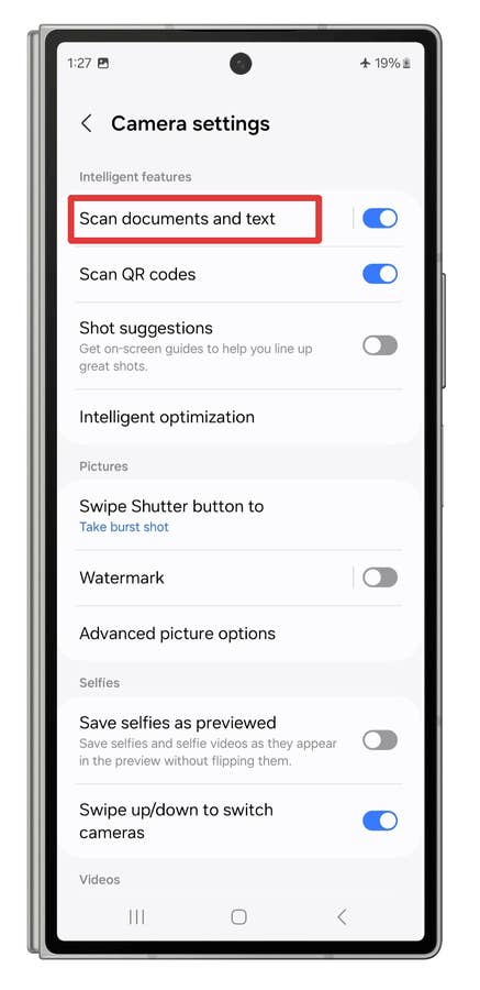 But beware, if your fingers are too close to the text or other elements of your document, you’ll end up with an unreadable mush of pixels. Sometimes, Samsung also has trouble recognizing a finger and doesn’t erase it automatically. In any case, you can always use the object eraser in post-processing to manually “clean up” your scanned document.