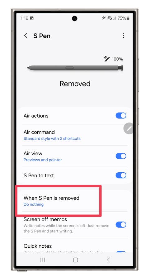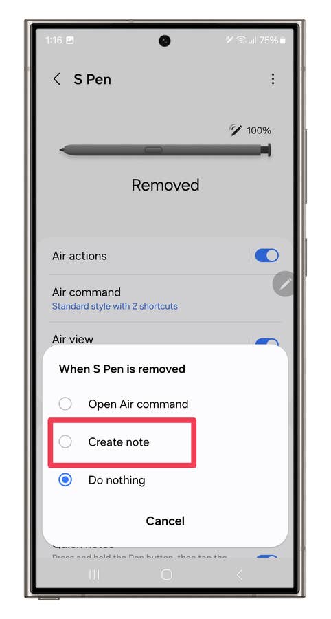Below are the steps to set up the feature of removing the S Pen to automatically create a note: