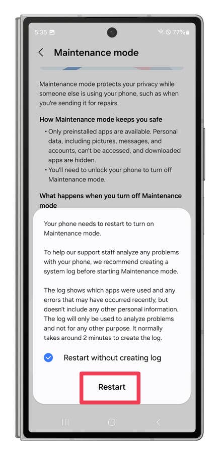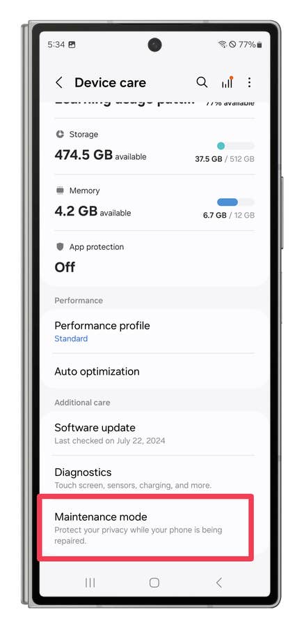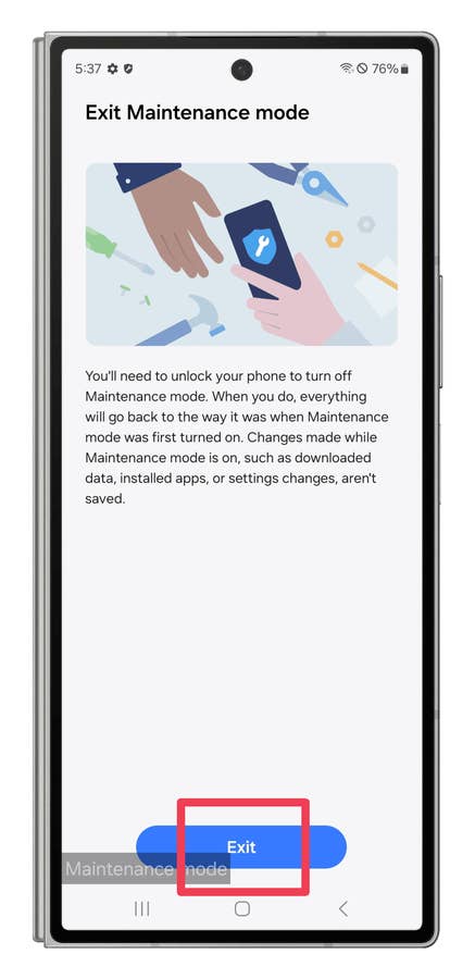 If you need to send your Galaxy smartphone for repairs, but the technician insists on having the phone unlocked (or needs it that way), you can use Maintenance mode to let them use the phone freely, without access to your personal data, files, and apps. Maintenance mode works similarly to a secondary profile on the phone, but is discarded as soon as you turn it off: