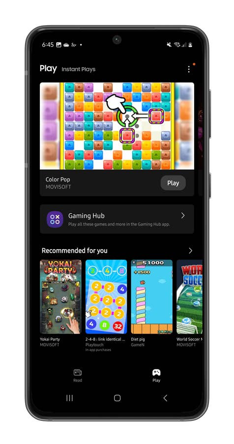 The Play tab offers a selection of free-to-play instant games across different categories, from arcade and puzzle games to one-handed and two-handed gameplay. These games can also be accessed via Samsung Game Hub.