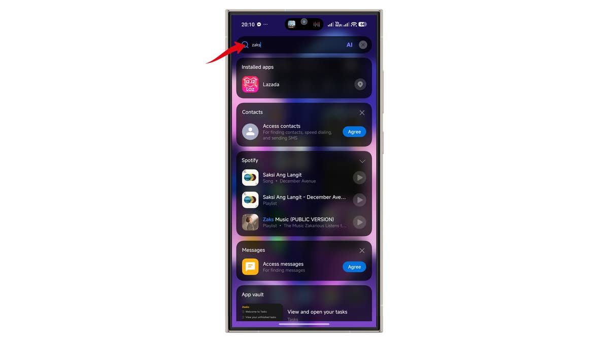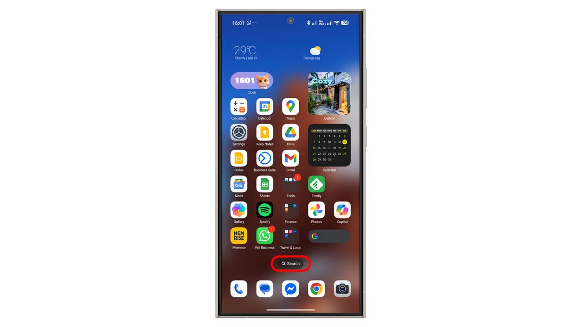 The home screen search functions as a universal search for apps, contacts, media, and files. It also includes a shortcut to get AI answers when you type questions.