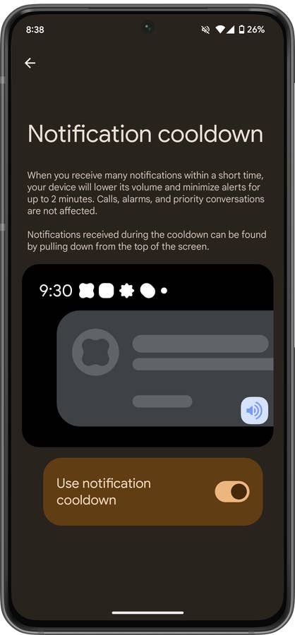 A new Notifications Cooldown feature helps reduce distractions by minimizing alert frequency and lowering notification volume when multiple messages arrive in quick succession.