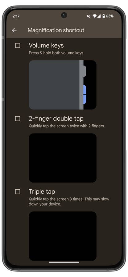In the Accessibility settings, the magnification feature now offers multiple shortcut options, including gestures and volume buttons. A new gesture allows users to magnify the screen with a double-tap using two fingers.