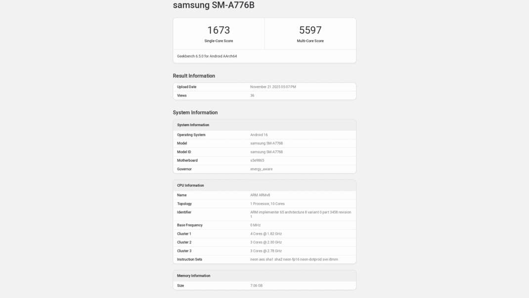 Even so, the benchmark scores show 1,673 and 5,597 points for single-core and multi-core, respectively. These numbers sit on the lower end of today’s flagship spectrum but remain close to the current Fan Edition entry. This suggests it is still a capable machine.