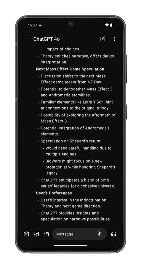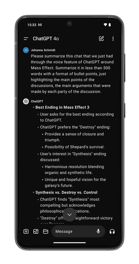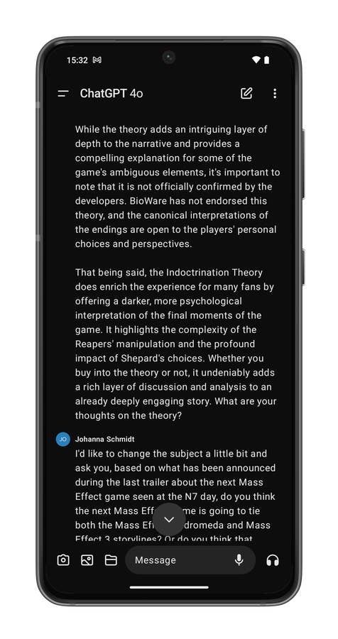 With the new “voice conversations” function, I spent a good fifteen minutes discussing and debating the best ending for Mass Effect 3. It was fun, but nothing more than that. Above all, you always have to go back through the application on your smartphone at some point. To send a text, an image, or a link, you have to do it manually.