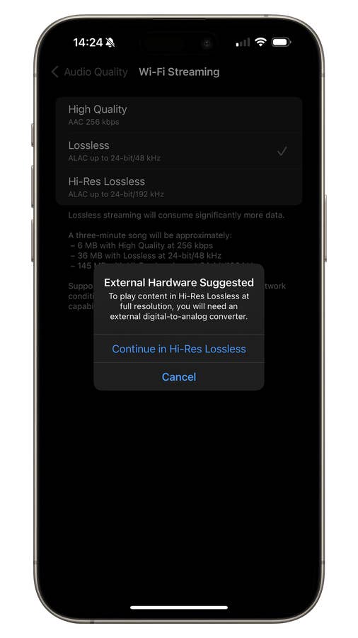 Basically, if you connect your AirPods Max to your iPhone via the cable mentioned below, you should notice better audio quality. But to really benefit from the very best that Apple Music has to offer (Hi-Res lossless in 24-bit at 192 kHz), you’ll need an external DAC. Apple itself indicates this in the Apple Music settings.
