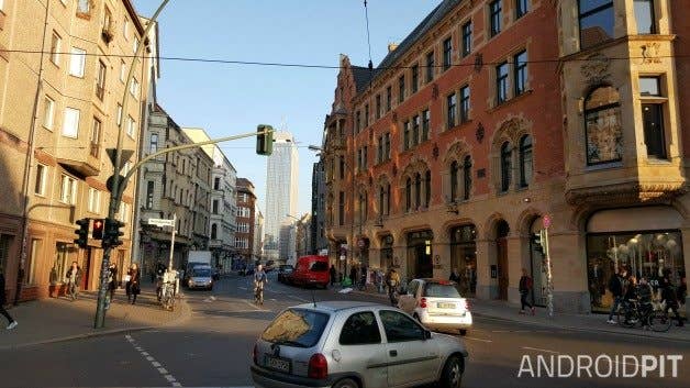 The Galaxy S6 camera managed to balance out the brightest patches of sunlight on the buildings to the left well with the rest of the street in shadow. Event he bright sky at the end of the street is clearly visible.