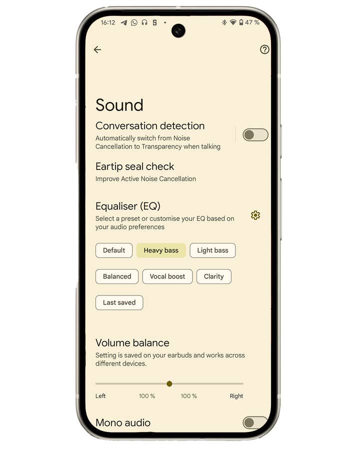 What I also really liked is Google’s equalizer. Although there are still no frequency bands you can make changes to, you can adjust the sound of the in-ears in five areas. If you don’t want to bother with this, there are also six presets that change the sound significantly and perceptibly. There is also the option to output music in mono, such as moments when you only want to wear one earbud. As a special feature, you can adjust the volume of the individual earbuds.