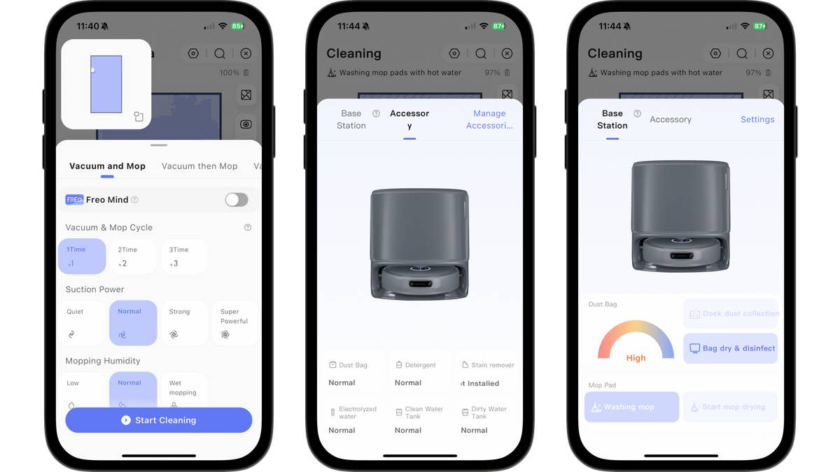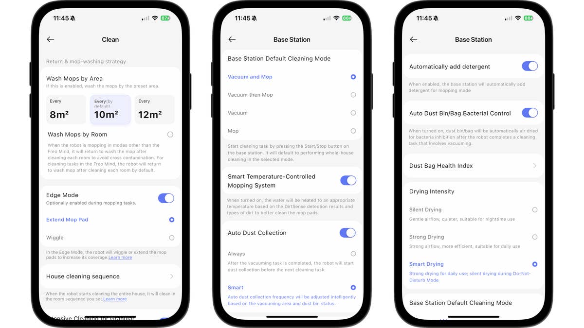 The Narwal Freo app has an appealingly designed user interface. All cleaning settings are accessible from the main menu. You can choose between four suction levels and three mopping levels. You can also adjust its navigation sensitivity, such as how rigid the robot vacuum cleaner should stick to its paths.