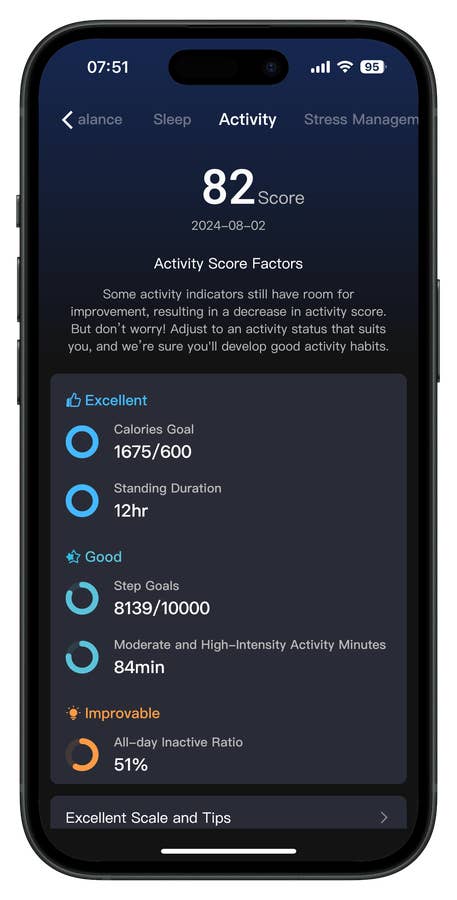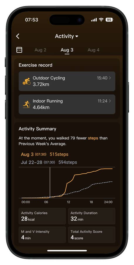 On the positive side, this smart ring provides a detailed analysis of daily activities, including steps taken, calories burned, standing time, and activity intensity. It even offers an Activity Score. The app visually breaks down calorie expenditure into basal metabolism and active calories, categorizes activity intensity, and compares it to the previous week.