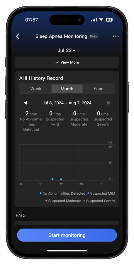The continuous sleep apnea monitoring feature is integrated into the app and is easy to set up; just ensure the app is running in the background and both the ring and phone are charged.