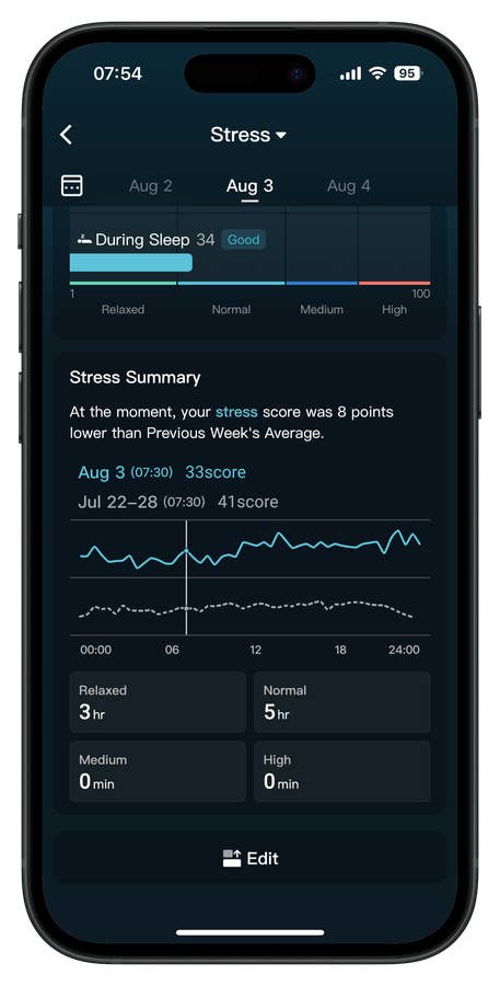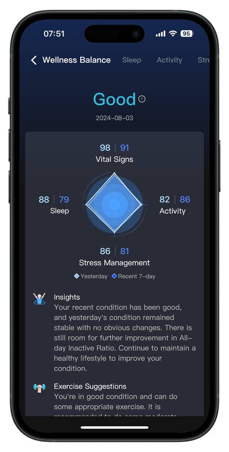 The app keeps tabs on your physical and mental state throughout the day, generating a score that ranges from Excellent and Good to Improvable. For that, data from the last seven days are used to compare with the current status of the wellness balance metrics.