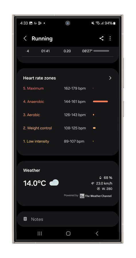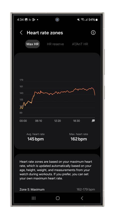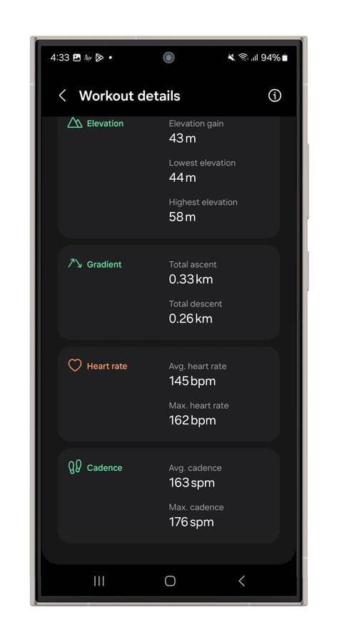 The Ring can automatically recognize your workout and track metrics like duration, distance, pace, heart rate, cadence, and steps. However, since it lacks built-in GPS, you’ll need to carry your smartphone to track maps and routes. Samsung tracks heart rate across five zones, and that’s pretty much all you’ll get.