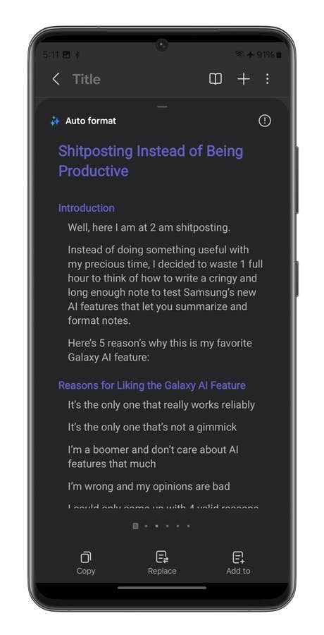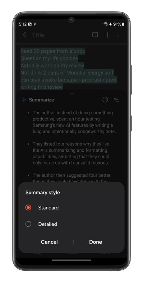 I also enjoyed using the Galaxy AI functions in the Samsung Notes application. You can summarize and format your notes accordingly. Samsung offers several layout styles for the “format” function. I even had a brief laugh (I was alone so I just chortled with some snot coming out of my nose) when the “summarize” function started talking about me, the author, in the third person singular.