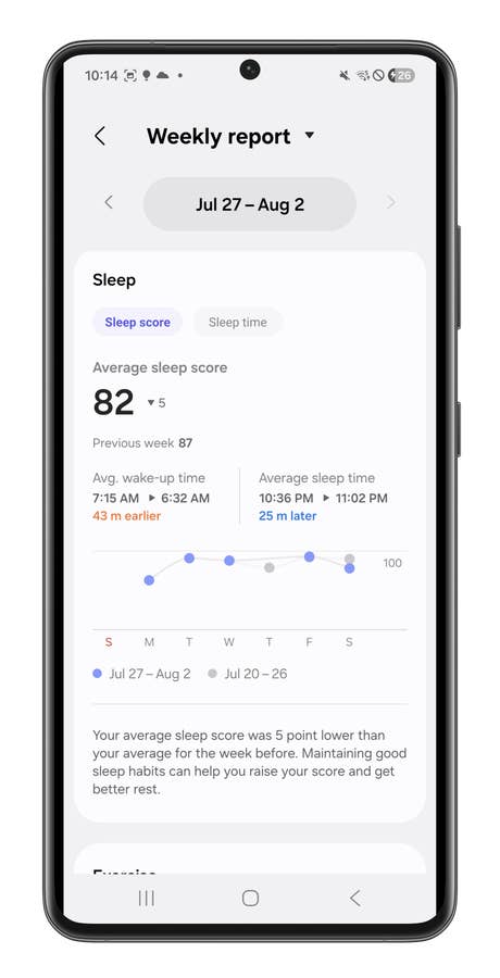 When I wore the Watch 8 Classic to sleep, it automatically created my baseline. The few times I deviated from it were mostly on days I was more active and my body was under more stress. To be honest, I found heart rate variability, resting heart rate, and respiratory rate—data I get from devices like the Whoop MG, Oura Ring 4, and Amazfit Active 2—more useful to understanding that.