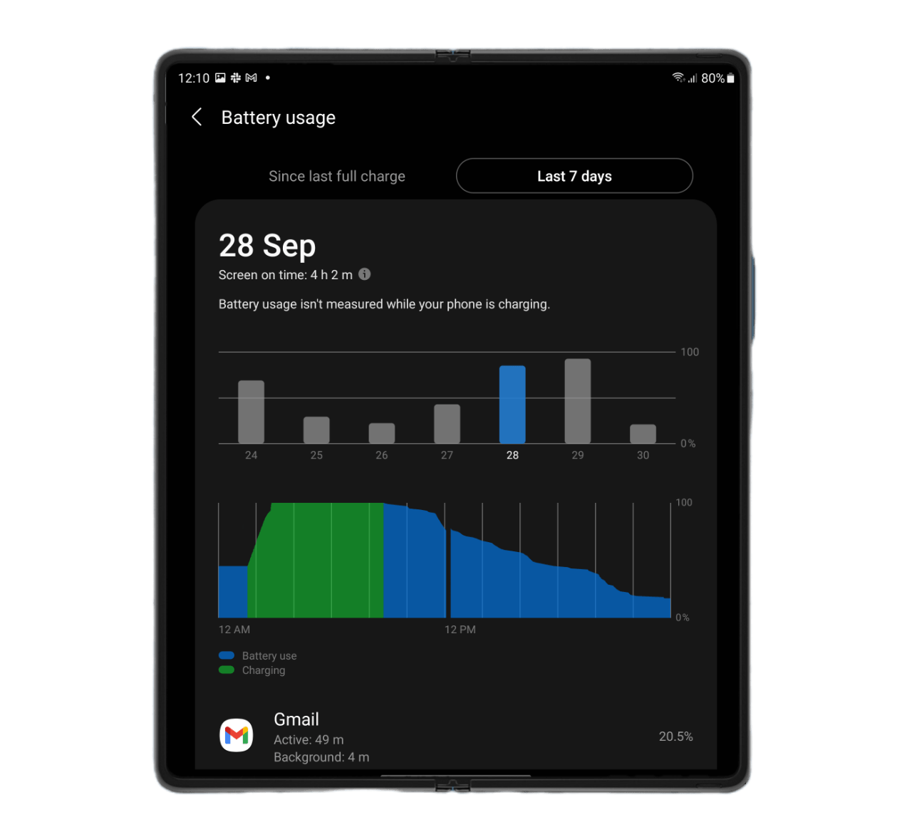 In actual use, I averaged over 12 hours before dropping to less than 10% with mixed folded/unfolded use of the smartphone. In extended unfolded use, the Galaxy Z Fold 3’s battery drains much faster and I dipped below the 10% of remaining battery life mark after just over 8 hours. That’s enough to last a day at the office, but not enough for a full day’s use.