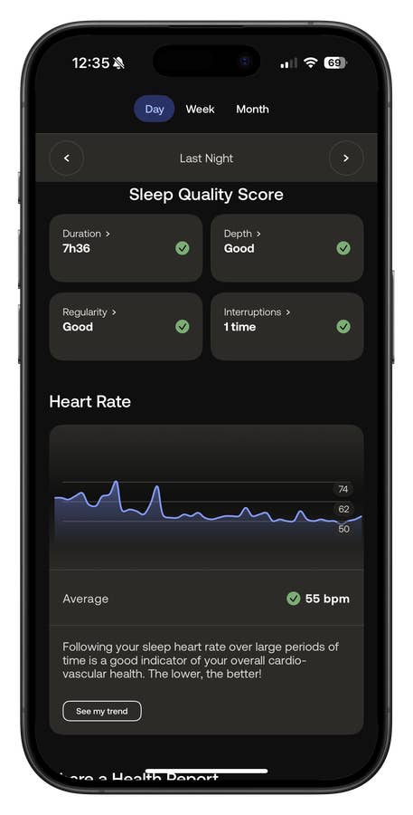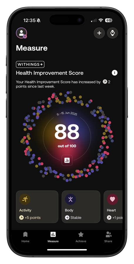 The Withings Plus subscription includes a “health improvement score”, for instance, which combines metrics from categories such as “activity”, “body” and “heart” into one score. In greater detail, behaviors such as exercising more often or sleeping more regularly have a positive impact on the score. A lower heart rate variability or a higher resting heart rate during sleep has a negative effect. This allows you to quickly see which behavior you should change for a better health improvement score. Great idea, but terrible name!
