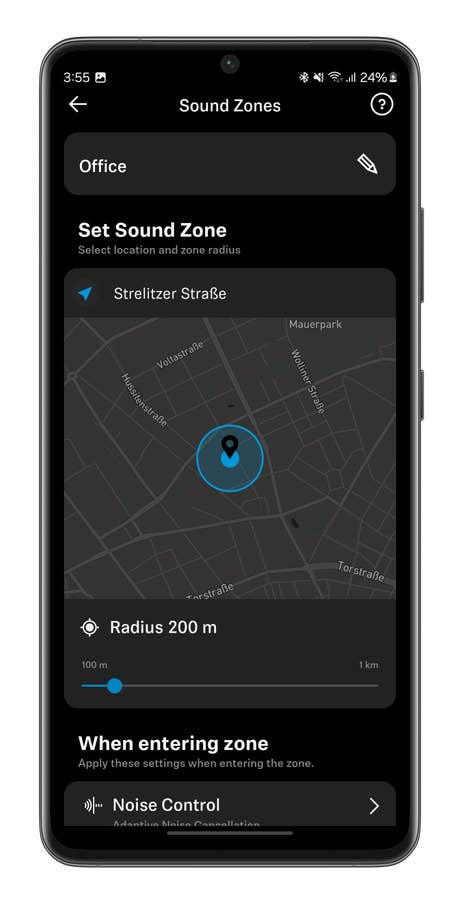 Finally, a word about the Sound Zones function. You can create presets for Active Noise Cancellation within a specific perimeter, such as the office. The headset will automatically change its behavior depending on whether you enter or leave that zone. Personally, I’ve defined a 200-meter perimeter around my office.