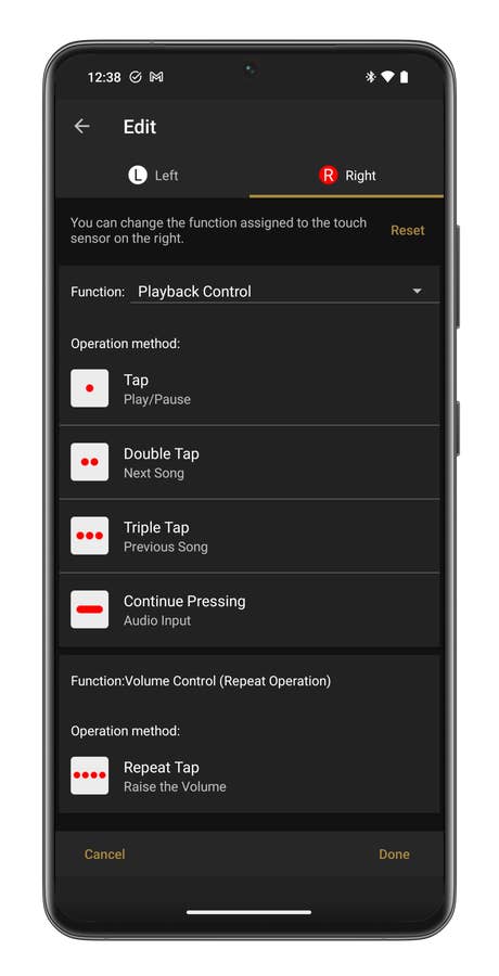 The touch controls are very comprehensive but not customizable enough in my opinion. Basically, each earphone can recognize four types of touch control. Each touch type corresponds to a specific function with the functions being grouped into two categories. You can change the category for each earpiece. Within this category, the commands remain the same and are associated with the same gestures.