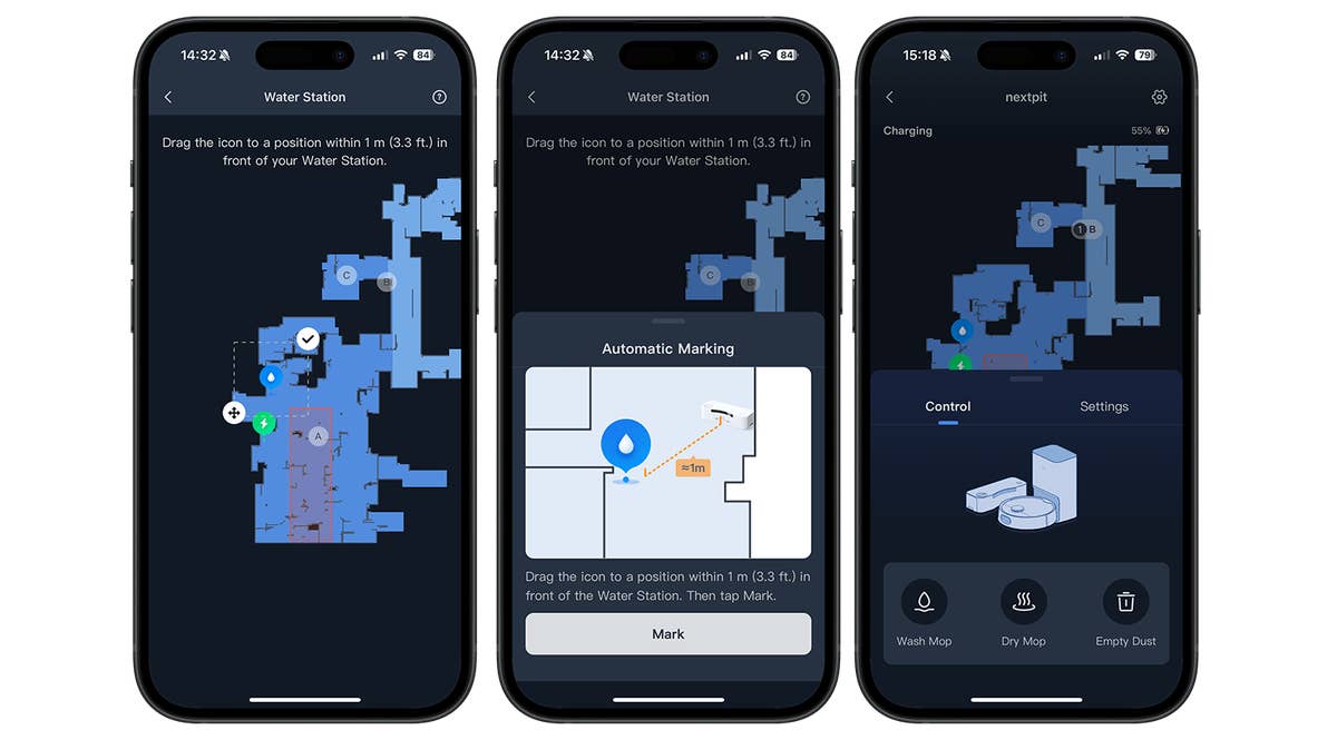 The next step is to add the water station to the map. To do this, mark the location of the water station on the scanned floor plan. The S10 then drives to the specified location and parks, as in the self-emptying station. In our review, pairing only worked on the third attempt. Finally, the robot vacuum cleaner is ready for some cleaning action!