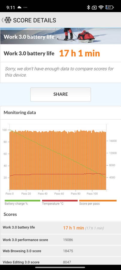 On the PCMark battery test that simulates a constant workload with the screen on, the Xiaomi 15 lasted 17 hours running the test between 80 and 20% charge, which is a good score for such a compact phone.